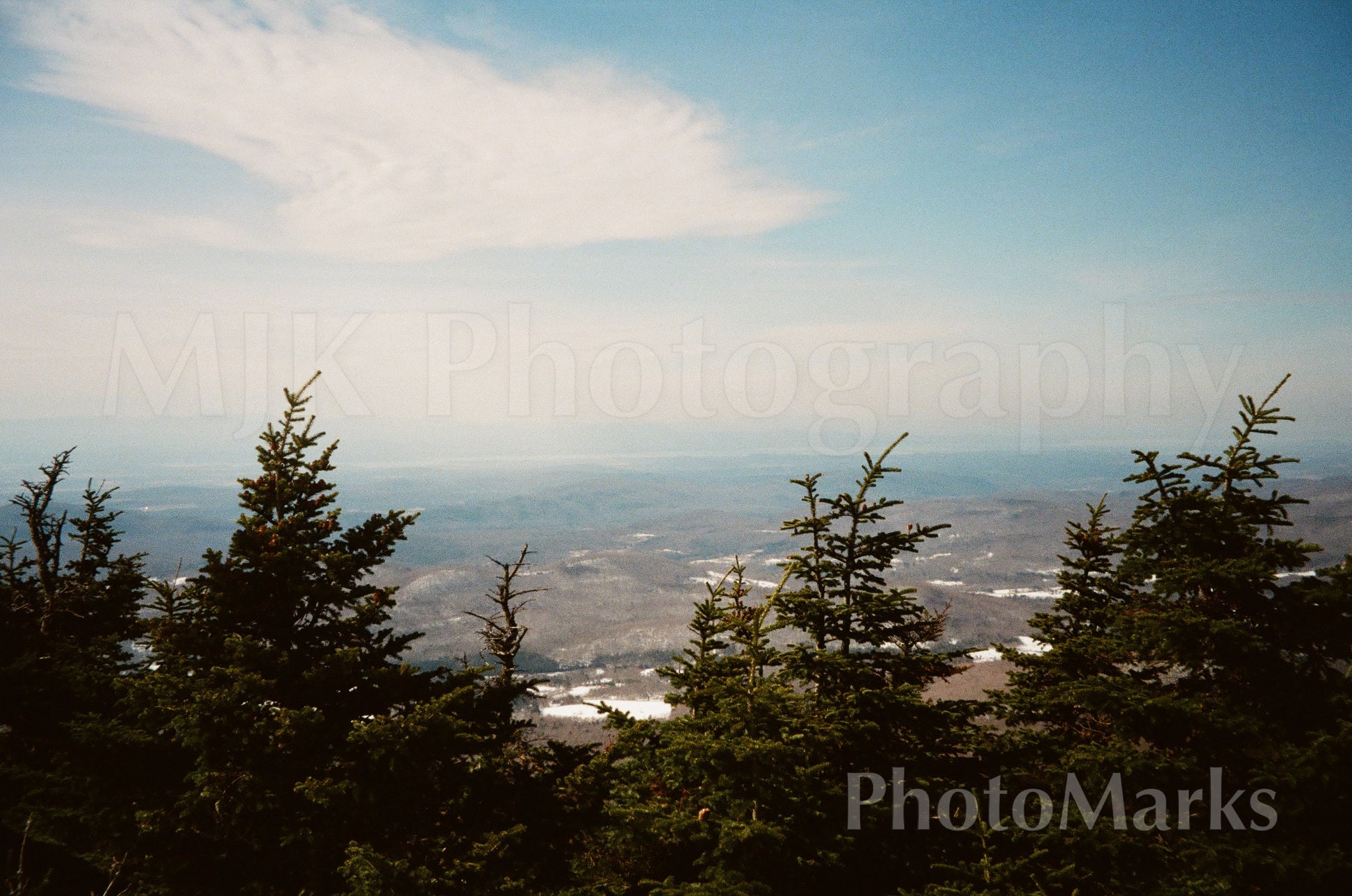 This horizontal landscape photograph provides an expansive view from a high elevation, in Northern New Hampshire.